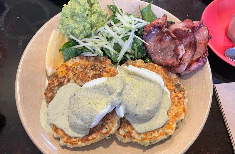 CafeGo has apparently been around for over 3 decades. It’s eclectic, quirky & cozy today with the wood fire burning.. love the overall ambiance, the digital ordering adds convenience & is perfect for bill splitters! But our only interaction with staff was when they brought our food - it was polite but hardly engaging. They know how to make a great coffee with body & caramel tones to the Proud Mary blend. But for me, our breakfast lacked basic seasoning therefore food was good where it could have been great. We had the classic corn & zucchini fritter which were light, fluffy & tasty adding a side of avocado & bacon. And I had a Persian eggs adding mushrooms & bacon as well. The eggs poached well but spinach could have been squeezed out a bit more as my toast was soggy & both the spinach & my mushrooms needed seasoning.