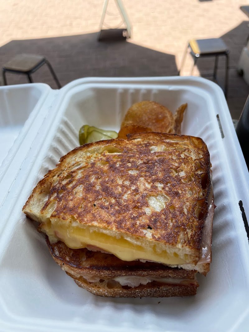 Perfect arvo snack. Ham, cheese, tomato toastie. The pickles and crisps on the side were a nice touch. Delicious mocha to round it out. All spot on. Friendly staff. A nice stop in the city.
