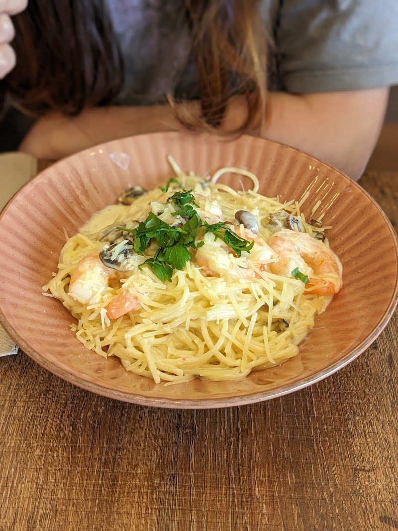 I'm writing this review before I even finish my food, it's that good. I ordered the prawn spaghetti. Deliciously creamy sauce, not too large of a meal. The iced Prana Chai was very good, not too sweet.